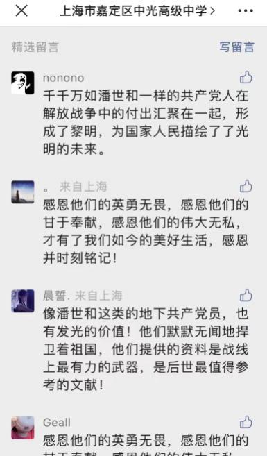 区档案馆挖掘馆藏红色资源,以红色档案微视频的形式,以中光高级中学“读书节”为载体,以学校微信公众号为平台,推送红色档案史料,在疫情期间,为中光学子们送上一堂堂短小精悍却史料丰富的“四史”教育线上课。此次活动共推送“独角楼里的红色记忆”“莫辜负不再的韶光”“黎明前的战斗”“抗美援朝,保家卫国”等四件红色档案影像资料,组织学生观看嘉定红色革命史料、倾听红色革命故事,学习嘉定革命党人的英雄事迹和奉献精神。这些贴近学生的本土红色影像资料更能引起学生的浓厚兴趣,从而产生共鸣。他们纷纷在公众号上进行留言,抒发自己的感想。最终,我们在这些留言中评选出精彩感言奖40名。