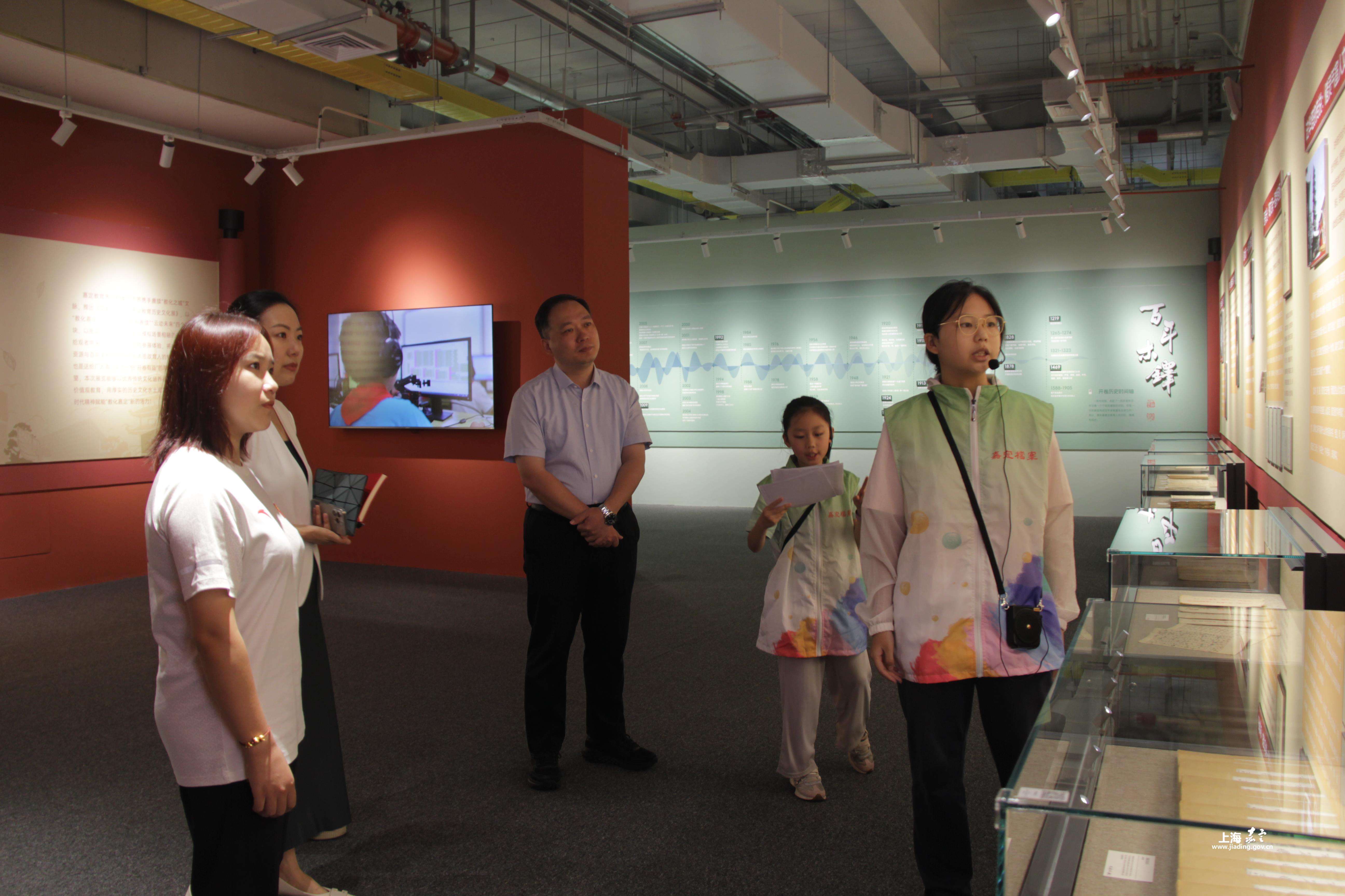 范忆琳一行参观了文教之根——嘉定教育历史文化展、地方志阅览室、嘉定典藏展等。参观过程中,范忆琳看到了自己的母校普通小学的校史资料,翻阅了嘉定方志中记录自己在世界比赛中得奖的篇章,勾起了很多回忆。其后,一行人观看了区档案局宣传片《档案方志里的嘉定》,详细了解了区档案、方志的工作情况和最新成果。